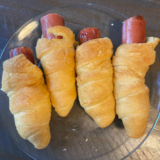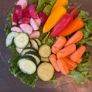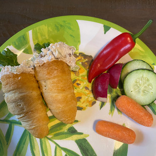 Tyler and I both really like chicken salad, so when I saw these carrot rolls on Pinterest, I knew putting these together would be fantastic for this theme. Making the rolls is really simple. You take crescent rolls and wrap them around tin foil shaped like cones. Bake them as usual and when they come out, they look like carrots. For the chicken salad, I bought a rotaissaire chicken and took off all the meat and shredded it into pieces. I mixed together mayonnaise, mustard, celery, walnuts and chives with the shredded chicken and let it sit for at least an hour. When it was time to eat, I stuffed the chicken salad into the carrot rolls. Turned out delicious and awesome looking. Since I knew the girls wouldn't eat the chicken salad, I cooked hot dogs, cut them in half and stuff them into the carrot rolls. Girls loved this just as much as we loved the chicken salad! We also made a plate of various veggies that we stole from McGregor's Garden.